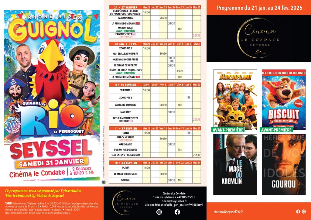 Ci-joint le programme de diffusion du cinéma "Le Condate" à Seyssel, du 21 janvier au 24 février 2026.
