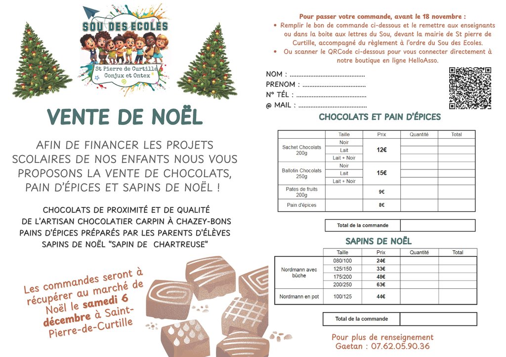 Vente de Noël organisée par le Sou des écoles de Saint-Pierre, Conjux et Ontex: Sapins, Chocolats et Pains d'épices.