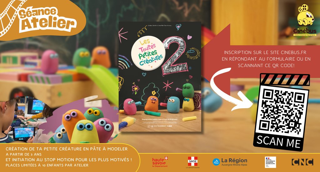 Inscription à l'atelier : Scanner le QR code figurant sur le visuel de l'atelier, ou inscription sur le site internet de Cinébus, ou en partageant directement le lien du formulaire.